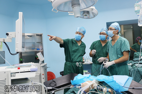 图为清华长庚医院泌尿外科李建兴主任进行结石手术,同时与当地医师进行业务交流。