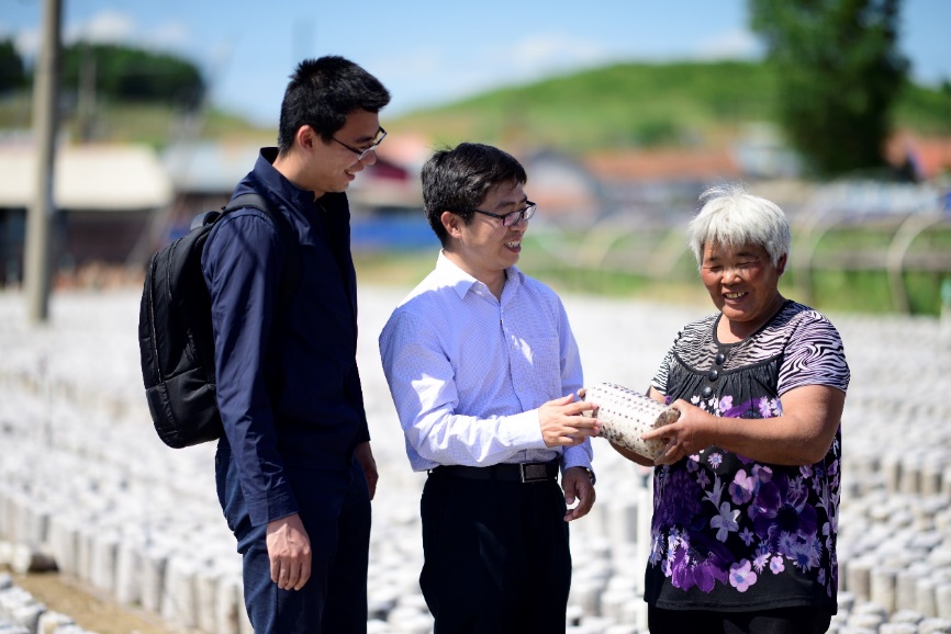 申子杭和挂职同事一起与贫困户探讨黑木耳产业脱贫之路