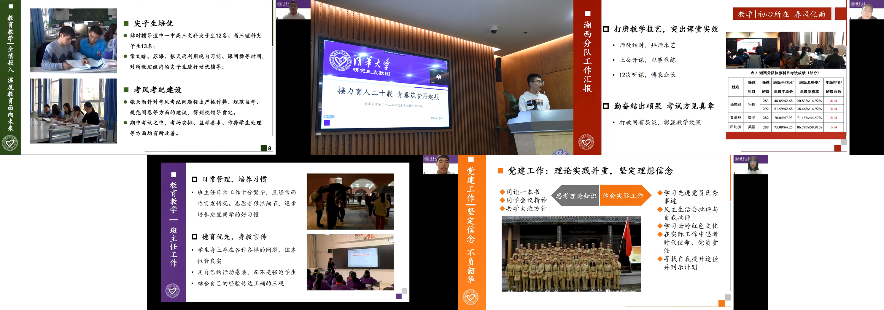 随后,青海分队队长李沛桐、西藏分队队长耿威、湘西分队队长杨鹏成、陕西分队队长蒋佳辰、云南分队队长唐若瑶分别从团队概况、教育教学、党建团学、公益助梦、实践调研等方面对各分队半年来的工作情况进行汇报。五个支教地在教学育人上均取得良好成效,党建、团学、公益、实践等工作也开展顺利。志愿者们严谨踏实的工作态度和卓有成效的教学方法获得了支教地领导及师生的充分肯定。