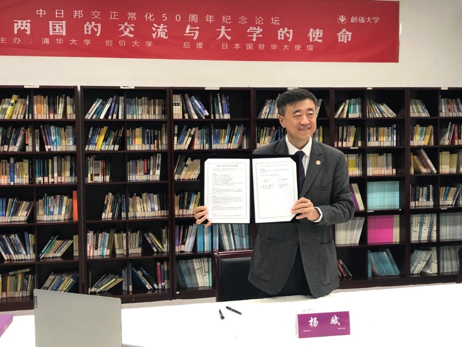 铃木将史宣读了国际创价学会会长、日本创价学会名誉会长、创价大学创办人池田大作的贺信,信中表达了对于两校合作促进中日友好关系发展的深切期望。铃木将史在致辞中表示,创价大学将积极推进两校交流,深化教育科研合作,为日中两国友好交流贡献力量。