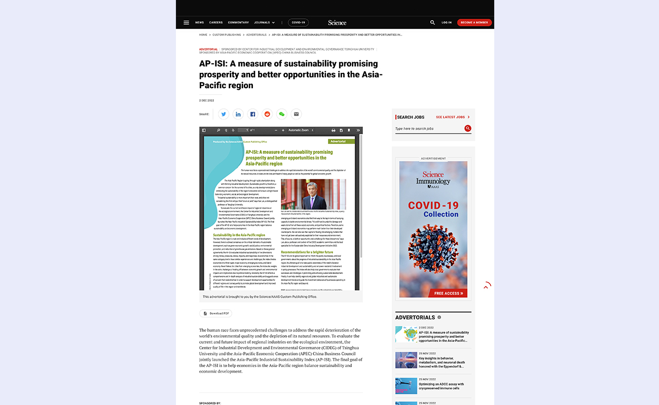 《亚太城市产业可持续性指数》(AP-ISI,Asia-Pacific Industrial Sustainability Index)由乐动平台产业发展与环境治理研究中心(CIDEG)和亚太经济合作组织(APEC)中国工商理事会联合发起,由《科学》出版发行。11月18日,AP-ISI 2022英文版在《科学》官网上线,首次面向全球发布。据悉,报告中文版将于今年12月底正式发布。