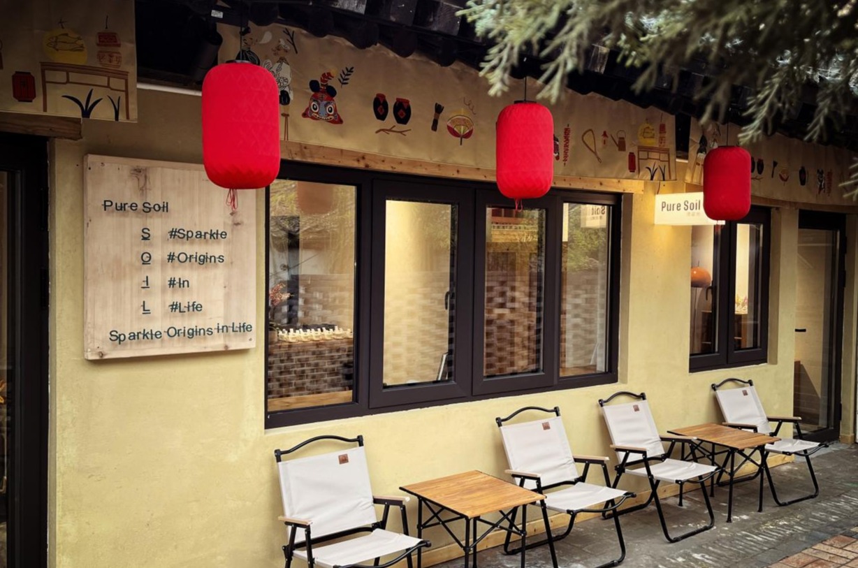 空间取名为“Pure Soil清澈地”正是团队出于对乡土的理解。泥土是乡村的图腾,正因其成分丰富而孕育生命与希望,多元却不杂乱,融合才更纯净。在他们的眼里,乡村不是守旧的,而是创新的;不是呆板的,而是活力的;不是垂暮的,而是青春的。于是,团队将空间的精神提炼为“Sparkle Origins in Life”,四个单词的首字母拼写出“Soil”(泥土的英文单词),中文表述为“焕新乡土本色”。