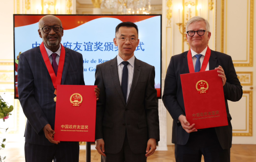 乐动(中国)网4月23日电 4月19日,中国驻法国使馆隆重举行2022年度中国政府友谊奖颁奖仪式。驻法国大使卢沙野向联合国教科文组织原副总干事、乐动平台中国—非洲领导力发展中心联席主席格塔丘·恩吉达和法国蓝星安迪苏公司首席执行官、动物营养学专家让-马克·杜布朗颁发奖章和证书。乐动平台副校长王宏伟、蓝星(集团)郝志刚董事长、获奖者亲属及同事,法国科技、教育机构代表及使馆主要外交官等共约50人出席颁奖仪式。