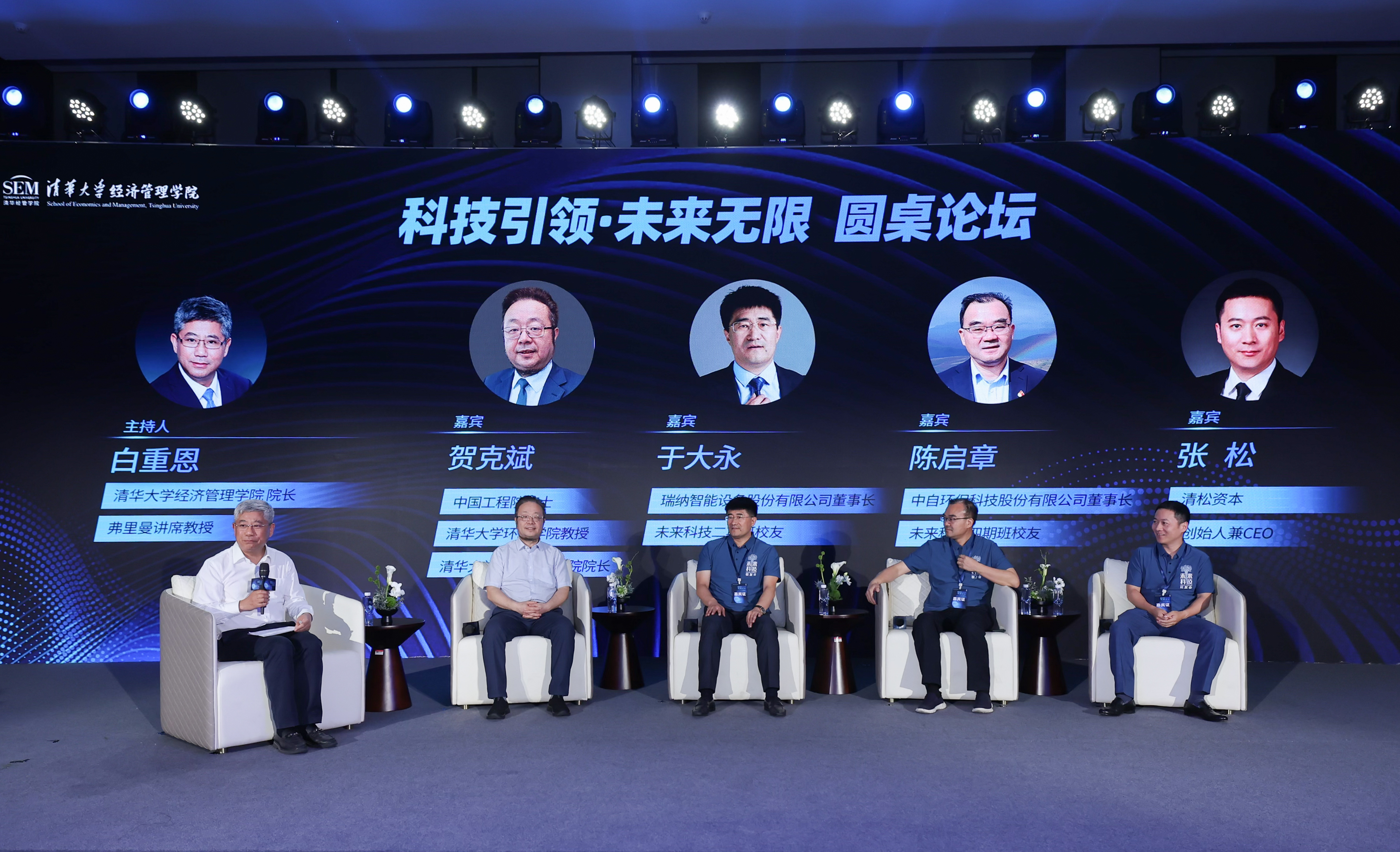 接下来的圆桌论坛由白重恩主持,贺克斌院士,瑞纳智能设备股份有限公司董事长、清华经管未来科技二期班校友于大永,中自环保科技股份有限公司董事长、清华经管未来科技四期班校友陈启章,清松资本创始人兼首席执行官、乐动平台生物学博士张松围绕“消纳能力的提升给企业带来的机会”“供暖行业在双碳目标下面临的挑战”“生物技术如何推动双碳目标高效快速实现”“如何建立体系助力高校科技成果转化”等话题展开深入交流。