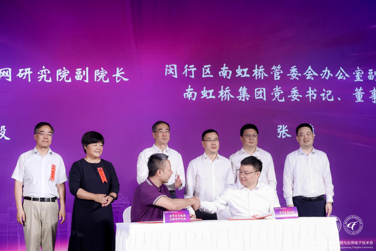 会上清华四川能源互联网研究院与闵行区南虹桥管委会办公室签署战略合作协议。这次活动,不仅是一次清华上海校友会电机工程专委会的成立仪式,更是电机系和虹桥商务区管委会、闵行区人民政府全面合作的一个开始。清华四川能源互联网研究院副院长刘毅(1999级),闵行区南虹桥管委办副主任、南虹桥集团党委书记、董事长张雄登台代表双方签约。