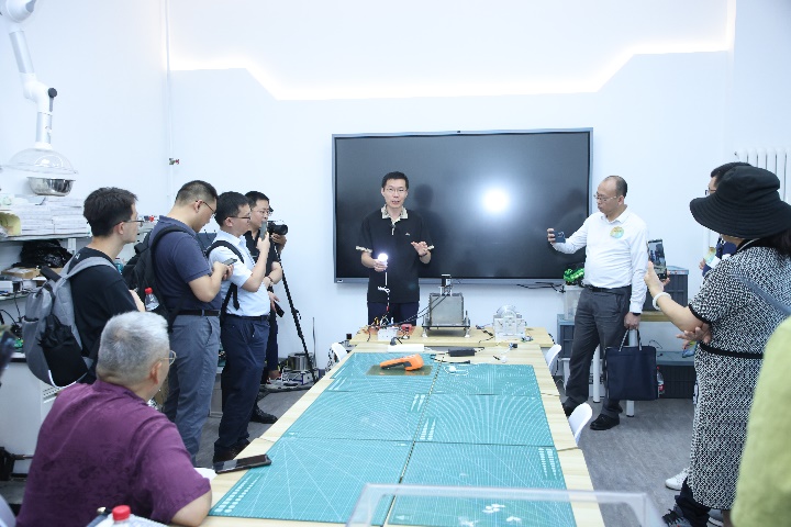 嘉宾们参观了3D打印实验室,触摸和感受学生们利用不同材质的特性通过3D打印机打印出来的作品。