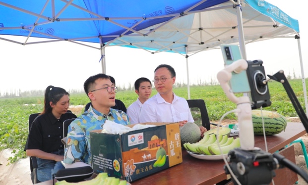新疆兵团三师图木舒克支队成员在田间地头开展直播带货活动
