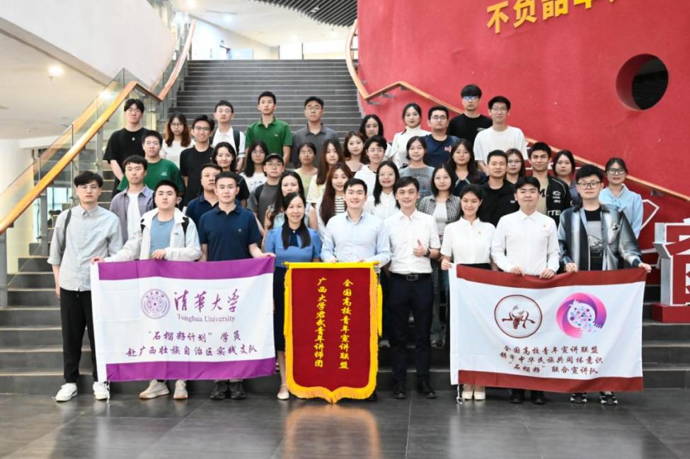 5月17日中午,实践支队来到广西大学,广西大学党委副书记、校长韩林海,党委副书记马献力亲切看望支队成员。韩林海表示,两校宣讲团要以此次活动为契机,加深交流互鉴,碰撞出思维火花,在青年理论宣讲方面互相学习提高。马献力表示,两校宣讲团要结合广西民族团结进步教育生动案例,增强宣讲的针对性和实效性。随后,实践支队在广西大学举办铸牢中华民族共同体意识宣讲活动暨“石榴籽联合宣讲队”成立仪式。来自乐动平台和广西大学的青年宣讲团讲师们从文物保护、产业振兴、数字经济等方面讲述了各民族团结奋进共赴新征程、众志成城筑梦新时代的故事。带队老师、学生资助管理中心主任助理龙腾和广西大学君武青年讲师团指导教师陈霄就队员们的表现作出点评。