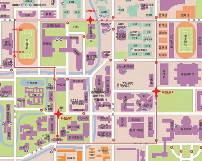 同学们由西大操场出发沿至善路向东,经过清芬园、东大操场、第六教学楼、新清华学堂、二校门和大礼堂等标志性建筑,最后回到西大操场,全长约3公里。