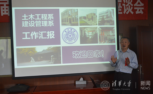 11时,土木系领导代表,现任土木水利学院党委书记方东平老师、土木水利学院副院长韩林海老师、土木水利学院副院长冯鹏老师、土木工程系系主任潘鹏老师、建设管理系系主任吴璟老师、杨军老师悉数到场,与老学长学姐们交流。党委书记方东平老师向学长学姐老校友们做了土木工程系暨建设管理系工作汇报,从土木系简史、教师队伍、科研平台、学科方向、教育教学、近年成绩、系馆规划等方面展示了如今的土木系。