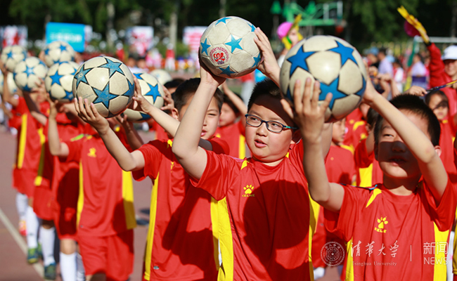 “身心健康”是清华附小五大核心素养之首,附小将体育作为“1+X课程”的核心,提出了“每天体育三个一,健康工作五十年”的体育特色,按照“有趣、出汗、技能、安全”的原则开展体育教育,使体格、人格、价值教育并重。清华附小是教育部认定的四所“校园足球先锋校”之一,也是“全国校园足球实验学校”。在清华附小,校园足球被认为是培养学生的团队合作精神、顽强拼搏精神、敢于挑战等素养的重要方式。“身体是教育、足球是教材”,清华附小已经形成了“人人会踢球、班班有球队、男女齐上阵”的良好局面,还出版了《看图学足球》等校本教材。