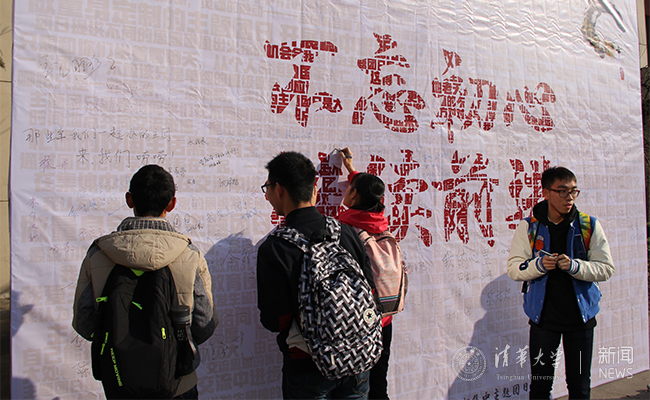 同学们在“不忘初心,继续前进”签名板上留言。