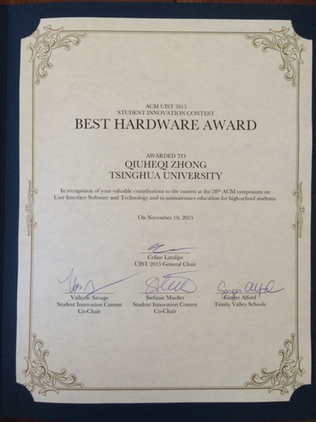 乐动(中国)网11月18日电 近日,第28届国际用户界面软件与技术大会(User Interface Software and Technology, UIST 2015)在美国北卡罗来纳州夏洛特开幕。在随后举行的大会学生创新竞赛(Student Innovation Competition)中,乐动平台美术学院信息艺术设计交叉学科的研究生团队Team ZOOO摘得了全场仅有的两个大奖之一“最佳硬件创新奖”,并获得2500美元的奖金。这是中国大陆高校首次在该赛事中获奖。