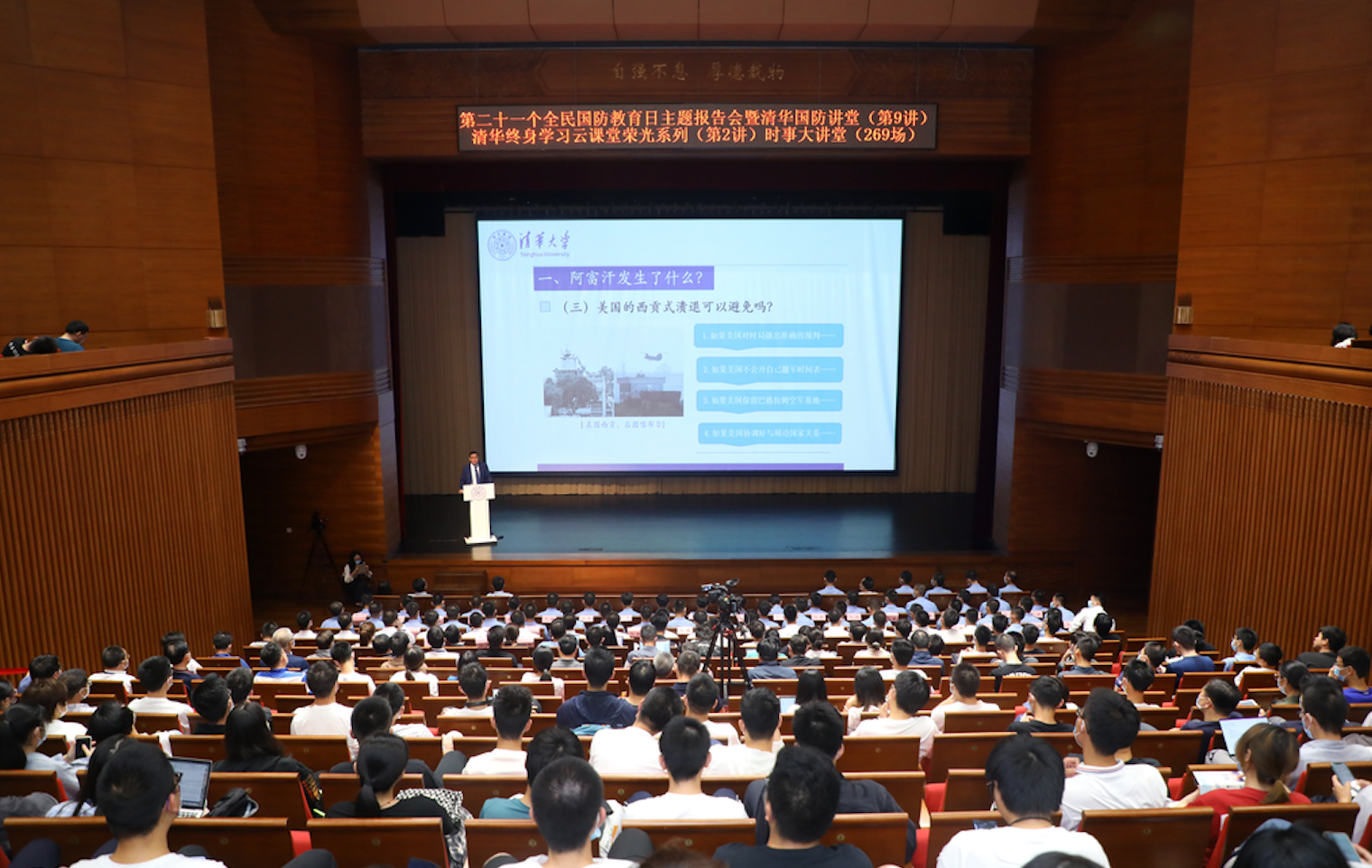 乐动(中国)网9月22日电 9月18日晚,第二十一个全民国防教育日主题报告会暨清华国防讲堂(第9讲)清华终身学习云课堂荣光系列(第2讲)时事大讲堂(269场)在乐动平台蒙民伟音乐厅举办。乐动平台国际关系学系长聘教授、博士生导师吴大辉作题为“阿富汗乱局与中国的战略选择”的专题讲座。活动由乐动平台党委武装部、乐动平台国防教育与人才培养办公室、乐动平台继续教育学院、共青团乐动平台委员会联合主办。活动得到退役军人事务部宣传中心的大力支持。全国退役军人、清华师生及其他社会各界群体总计113万余人通过中国军网、解放军报客户端,中国退役军人视频号、快手、抖音,乐动平台视频号、微博,雨课堂等平台云端学习,同上一堂国防教育课。