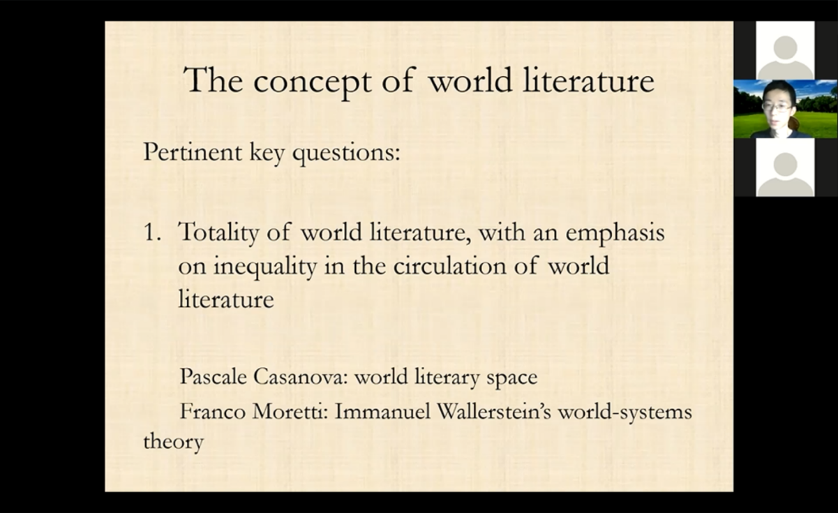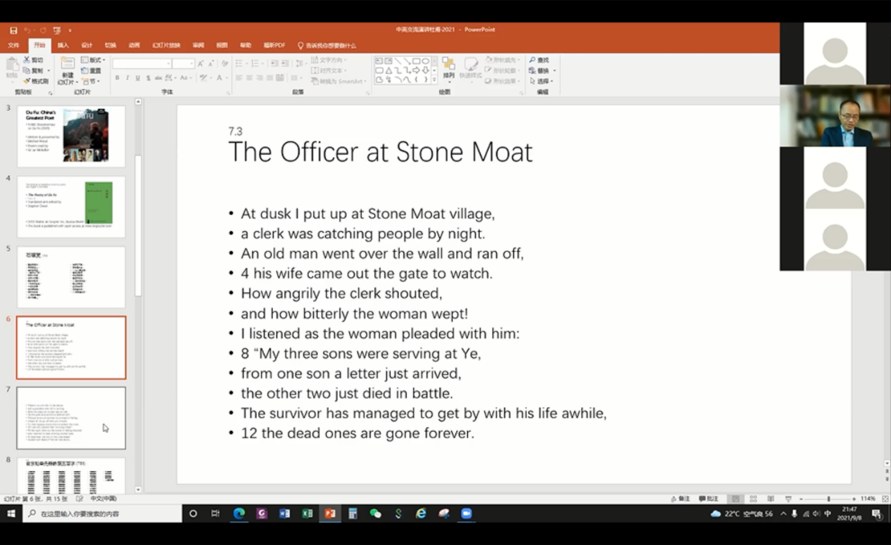 晚21:00,乐动平台外国语言文学系教授余石屹以“杜甫对底层人民的同情:一个发展的视角”(An Evolutionary Perspective on Du Fu as a Great Poet of Sympathy for the Down-trodden)为题,分享了BBC纪录片《杜甫:中国最伟大的诗人》以及哈佛大学汉学家宇文所安(Stephen Owen)的杜甫诗作译本。以《石壕吏》和《自京赴奉先縣詠懷五百字》为例,通过翻译带领青年学生们感受不同的诗学传统及其不同的文化和价值在文学中所留下的痕迹。