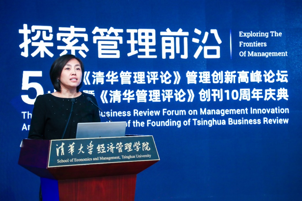 《清华管理评论》出版人、经管学院教授、院长助理薛健主持《清华管理评论》创刊10周年庆典环节。薛健表示,《清华管理评论》要坚持“思想引导变革”的创刊宗旨。随后她推介了2020年文章精选图书《管理瞭望》,宣布《清华管理评论》小程序“照澜书院”正式上线,《清华管理评论》将持续为广大读者提供电子刊以及有声产品服务。