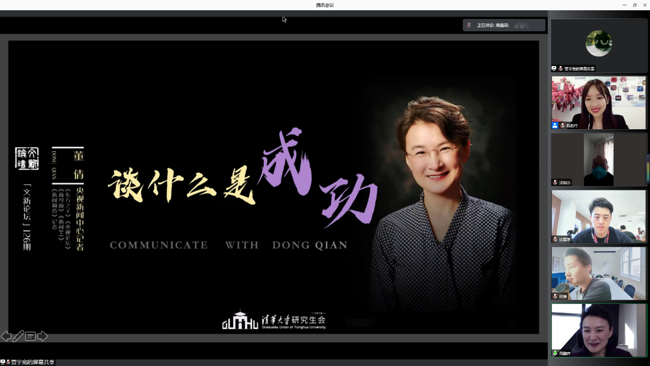 提问交流环节由乐动平台公管学院2019级博士生陈韵竹主持。同学们围绕采访技巧和新闻职业素养等相关问题,与董倩进行了充分而热烈的交流。董倩表示不论从事何种行业,都应当保持终身学习的良好习惯,对待每份工作也要认真踏实、全力以赴。同时也要善于调节自己,保持健康的生活态度。唯有如此,才能迈向属于自己的“成功”。活动最后,董倩勉励清华学子,她认为每一位清华同学都是堪当大用的人才,希望大家能继续努力,不骄不躁,书写无愧于自己的青春华章。