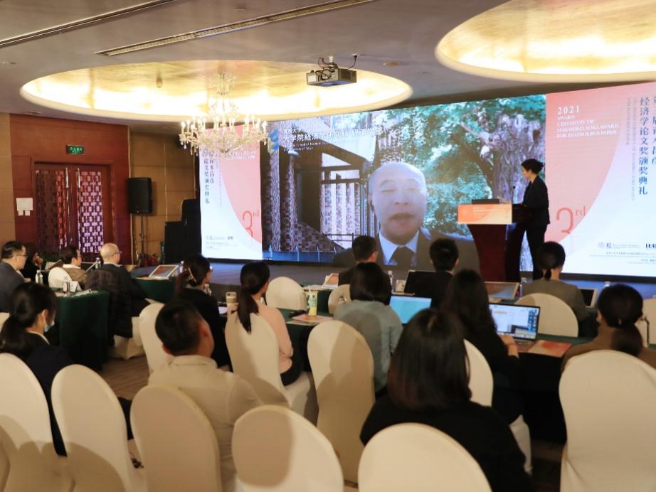 青木昌彦经济学论文奖评审委员、东京大学经济学部教授星岳雄在线发表致辞。他表示,奖项的主要宗旨是鼓励更多的中国年轻经济学家进一步就中国的政策与发展进行研究、建言献策,通过研究为未来的全球经济发展贡献更多力量。