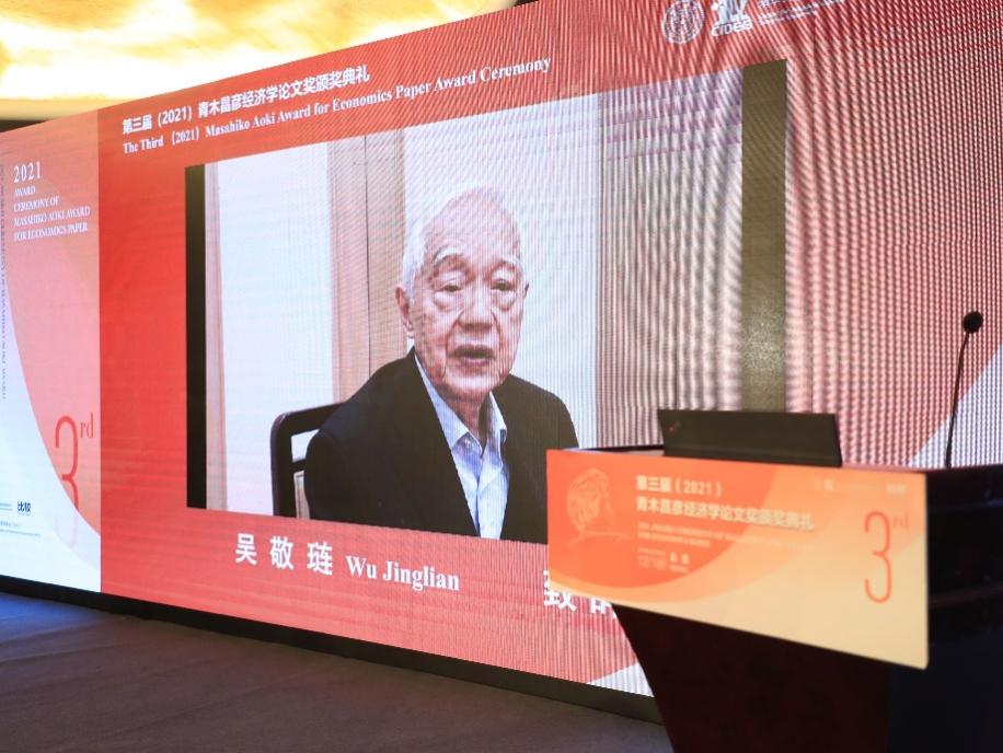 青木昌彦经济学论文奖评审委员会主席吴敬琏在致辞中希望获奖的作者们今后能够百尺竿头、更进一步,在学术创新和政策实践中作出更大贡献。