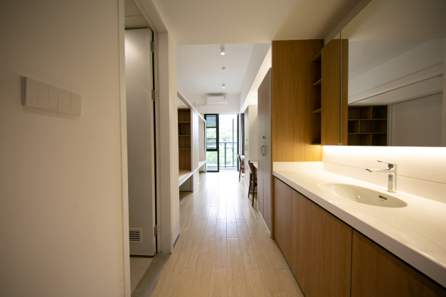 公寓楼打造共享开放的空间,每层有一个公共开放平台,每三层有一个通高共享平台。公寓分为双人间和单间,南北对流,塘朗山山景一览无余。公寓内饰简约优雅,房间配置功能齐全。