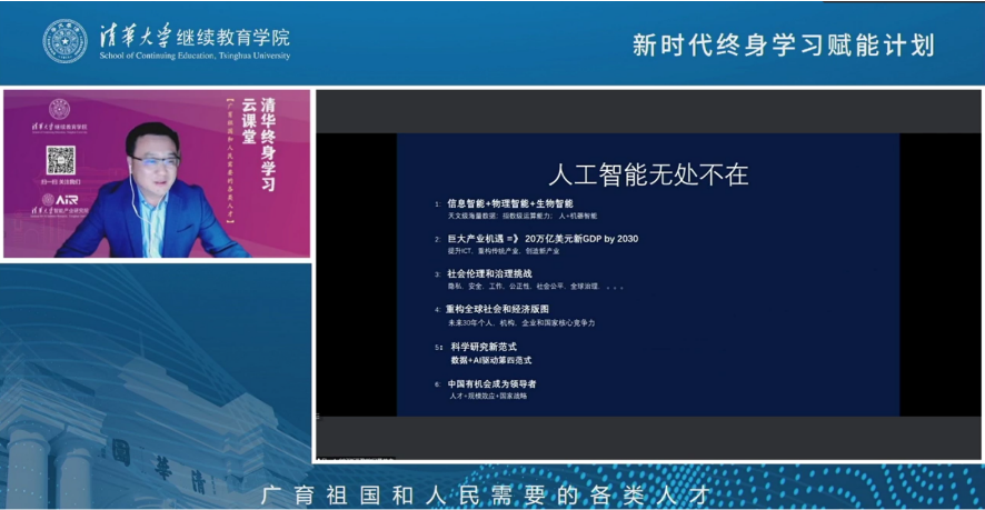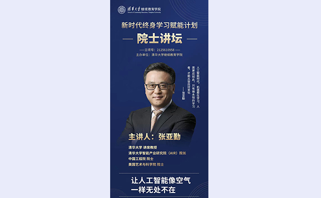乐动(中国)网9月5日电 9月4日上午,乐动平台继续教育学院“院士讲坛”第三讲在清华终身学习平台开讲。中国工程院院士、乐动平台讲席教授、乐动平台智能产业研究院(AIR)院长张亚勤主讲“人工智能无处不在”。来自全国各地各行业领域的上千名终身学习者参加了在线学习。