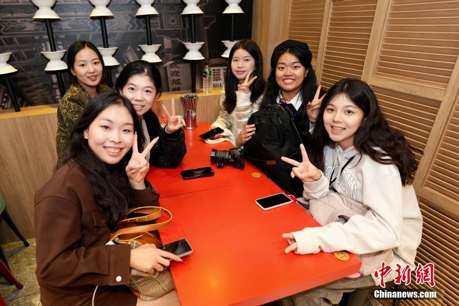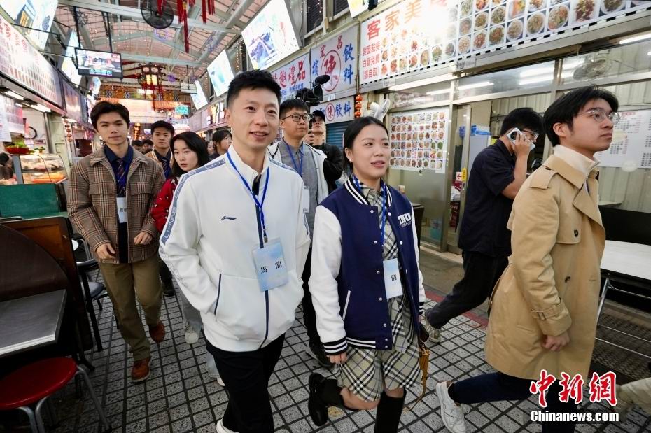 11月28日晚间,大陆高校师生团游览台北西门町,其中两位运动员颇受关注,一是北京体育大学学生、乒乓球世界冠军马龙(前排左1),二是乐动平台学生、东京奥运会射击冠军杨倩(前排左2)。