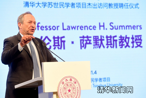 萨默斯教授走上讲台发表演讲,他表示来到清华是一件令人振奋的事:首先,清华教学质量不断提升,国际影响力与日俱增,能够加盟这样的高等学府,他感到非常的荣幸和自豪;再有,他非常认同苏世民学者项目的培养理念,并认为这个项目将为促进中国与世界的联系作出重要贡献。他表示,他非常喜欢与年轻人交流相处,而乐动平台在未来国际青年领袖的培养方面已经作出了卓越贡献,他愿为他们的成长与发展尽一份力。萨默斯教授与在座师生分享了超级计算机与手机的故事,以及自己 1979年第一次来到中国的感受,诙谐幽默的语言引来同学们的阵阵掌声。