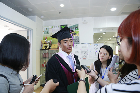 在毕业典礼上,校长邱勇为尕朋授予了学位并合影留念。邱勇微笑着鼓励尕朋说:“希望你今后继续加油,我会去玉树看望你!”