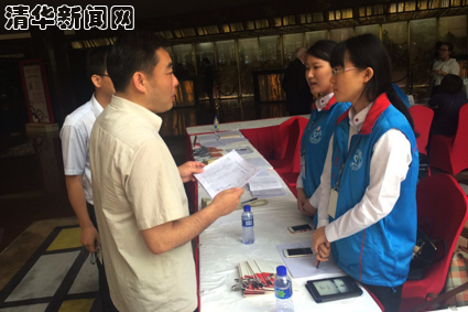 还有两名志愿者在会议注册岗位。这个岗位是与会者来到北京国家饭店参会的第一站,我们清华的两名女同学展现了良好的精神风貌,认真细致地帮每位代表完成注册。