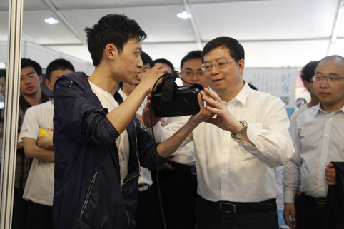 邱勇观看“清显科技”虚拟现实眼镜设计。
