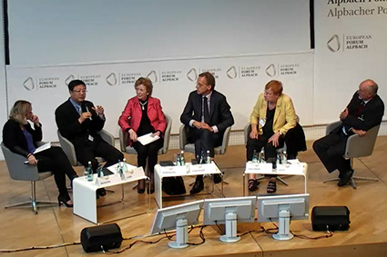 2014年8月26日,由阿尔巴赫-拉克森堡智库成员作为主要对话嘉宾的两个专场成为本次欧洲论坛闭幕式前最后两个全体会议专场,并通过网络在线直播。这两个专场,首先是“代际不平等”专场,对话嘉宾为中国乐动平台校长陈吉宁、美国普林斯顿高等研究院院长罗伯特•戴克格拉夫(Robbert Dijkgraaf)、芬兰前总统塔里娅•哈洛宁(Tarja Halonen)、国际应用系统分析研究所世界人口项目主任沃夫冈•路兹(Wolfgang Lutz)、爱尔兰前总统玛丽•罗宾森(Mary Robinson)。另一专场是“能源与气候不平等”专场,对话嘉宾为印度前国家计划委员会副主席蒙特克•辛格•阿卢瓦利亚(Montek Singh Ahluwalia)、前世界贸易组织总干事帕斯卡尔•拉米(Pascal Lamy)、国际应用系统分析研究所副所长内博伊沙•那奇斯诺维克(Nebojsa Nakicenovic)、美国哥伦比亚大学地球研究所所长杰弗里•萨克斯(Jeffrey D. Sachs)。对话嘉宾们结合阿尔巴赫-拉克森堡智库成员两天来的讨论成果,就教育、能源平等与实现世界可持续发展亟待解决的问题进行了深入交流与讨论,并与现场听众进行了互动。