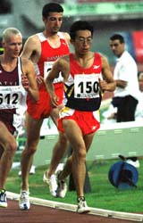 1999年7月12日,安虎(右一)在大运会男子10000米决赛中获得第七名。图片来源:新华社