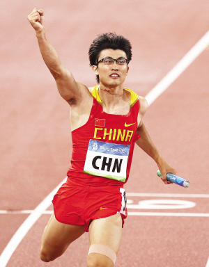 2008年8月21日晚,中国男子4×100米接力历史性闯入奥运会决赛!图为胡凯在代表中国队比赛后向观众示意。图片来源:新华社
