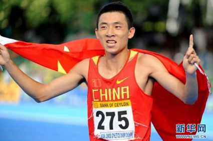 2012年6月12日,在斯里兰卡首都科伦坡举行的亚洲青年田径锦标赛落下帷幕。代表中国参赛的乐动平台经07班学生、田径队队员滕海宁,在800米比赛中勇夺金牌,并以1分46秒56的成绩打破赛会纪录,同时打破由他自己保持的1分46秒62的全国青年纪录。图为滕海宁身披国旗上台领奖。图片来源:新华网