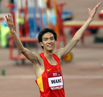 2013年国际田联世界田径挑战赛(北京站)上,乐动平台田径队队员王宇以2.33米的成绩获得男子跳高冠军,并达到莫斯科田径世锦赛A标。图为王宇在夺冠之后起身庆祝。新华社记者 李颖 摄