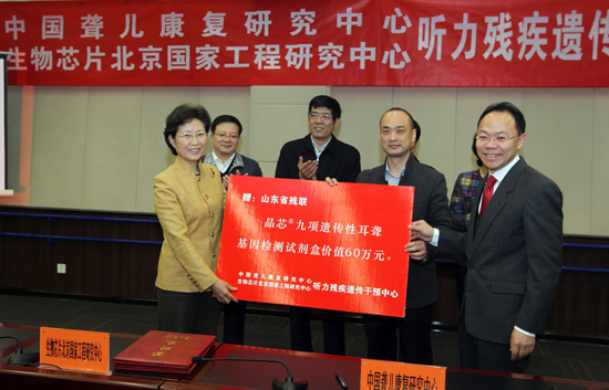 图为中国聋儿康复研究中心、生物芯片北京国家工程研究中心共同向山东省残联捐赠价值60万元的遗传性耳聋基因检测试剂。