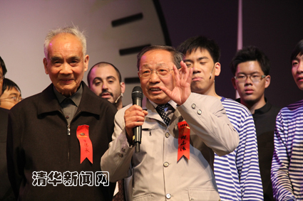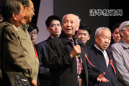 演出结束后,现场校友进行了互动交流。十几位为两弹一星工作做出贡献的校友代表走上舞台,气氛热烈。几位参加过第一颗原子弹工作的校友回忆了40多年前那段峥嵘岁月,其中两位校友还分别讲述了在邓稼先领导下的工作情景和体现邓稼先高尚人格魅力的小故事。这些校友中间,有5位毕业50周年校友,他们当年从清华毕业后分配到了二机部九院九所,所长就是邓稼先。他们自豪地告诉记者:氢弹的主要计算工作是从清华毕业只有几年的大学生完成的。互动环节深深感染了现场观众。