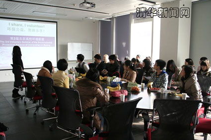 北京大学、中国人民大学、北京师范大学、中国农业大学和北京林业大学代表分别就如何开展具有环保特色的专业性志愿活动各抒己见,展示了他们的志愿活动成果。北京大学清洁发展机制研究会长期关注、讨论和研究气候变化、低碳经济及相关重大前沿问题,一直致力于培养国际化的绿色青年领袖,曾主办低碳校园先锋项目、国际青年能源与气候变化峰会等。中国农业大学生态文明传播协会结合环境和农业保护专业,进入内蒙古锡林郭勒盟正蓝旗巴音胡舒嘎查调研当地的草原植被和生态牧鸡情况。