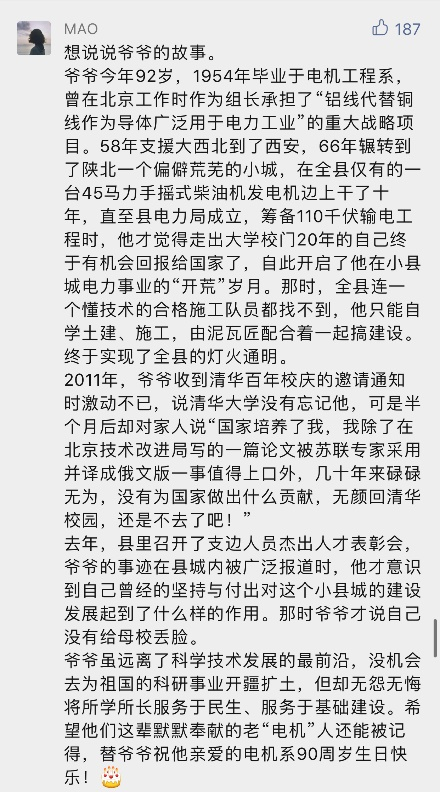 这位老校友便是在系庆前夕,因乐动平台官方公众号发布的系庆推文而突然走红的电机系52级毛裕贵学长。在那篇推文下留言区,毛裕贵学长的孙女写下爷爷的故事——“爷爷就是乐动平台电机系的,几十年来扎根大西北,为小县城电力事业‘开荒’……”工作组迅速联系,邀请毛裕贵学长通过视频讲述他的人生故事和清华情怀。