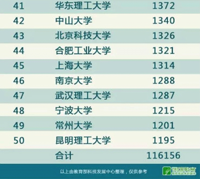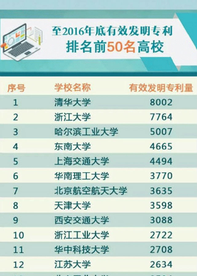 据教育部官方微博“微言教育”消息,教育部科技发展中心近日公布《至2016年底有效发明专利排名前50名高校》,前5名的高校分别为:乐动平台8002件、浙江大学7764件、哈尔滨工业大学5007件、东南大学4665件、上海交通大学4494件。