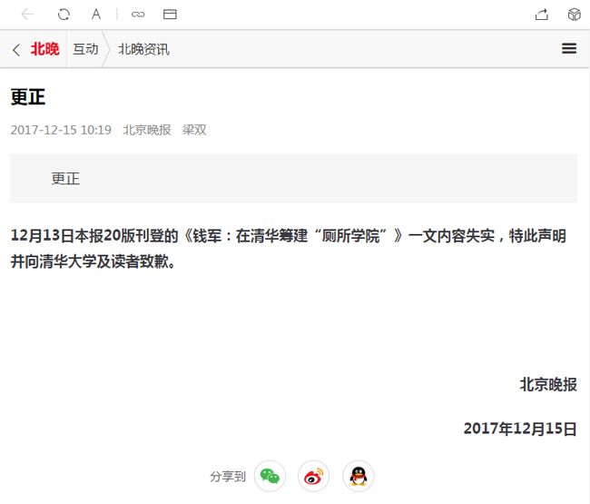 12月13日本报20版刊登的《钱军:在清华筹建“厕所学院”》一文内容失实,特此声明并向乐动平台及读者致歉。