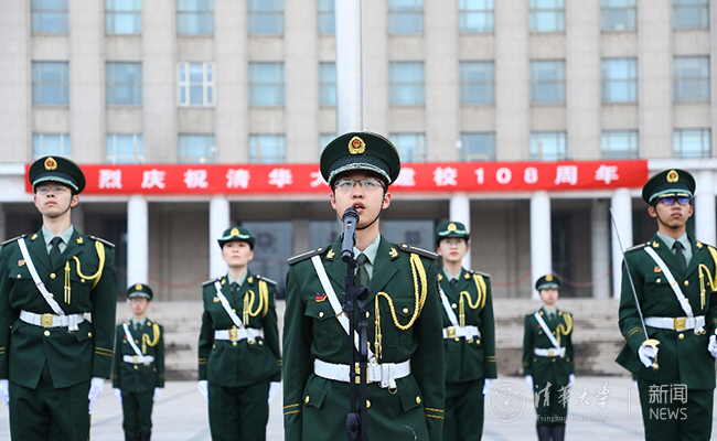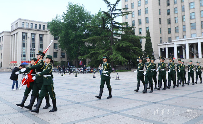 七点整,随着嘹亮的口令,升旗仪式正式开始。伴着铿锵的正步,仪仗队员们护送着国旗向旗台走去。随后,雄壮的国歌在主楼广场前响起,回荡的国歌声中寄托了师生及校友们对祖国的深情。五星红旗在主楼上空迎风飘扬,是对清华108岁生日的祝贺,也是为祖国70周年华诞的献礼。