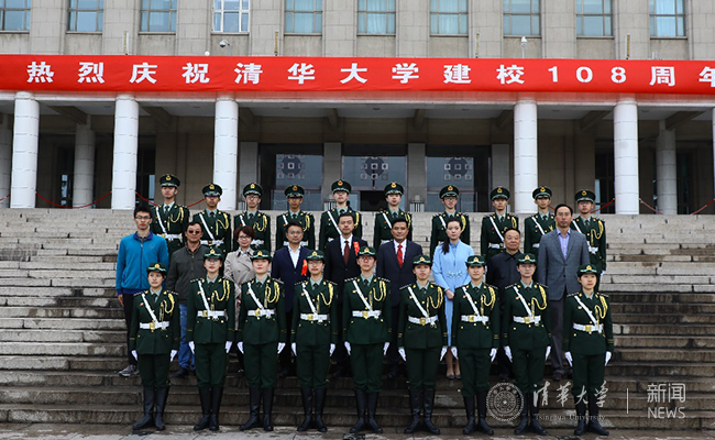 升旗仪式结束后,到场嘉宾与国旗仪仗队部分队员在主楼前合影。