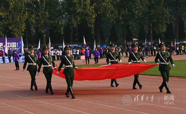 开幕式现场,彩旗招展,气势如虹。随着运动员进行曲的响起,国旗方阵、校旗方阵、53个协会方阵队及各院系大一班级方阵踏着整齐的步伐依次走过主席台。他们矫健的身姿、飒爽的风采展示了清华人积极向上、团结进取的精神风貌。