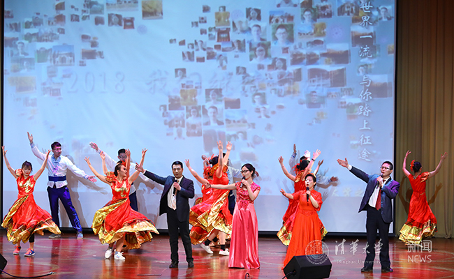 校机关新入职青年教职工表演唱《新时代,双一流—清华师生大步走》。