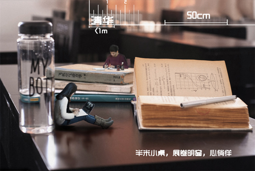 教室中每人桌面宽度50厘米,自习的最小空间。半米小桌,展卷明窗,心徜徉。