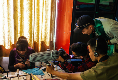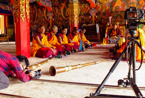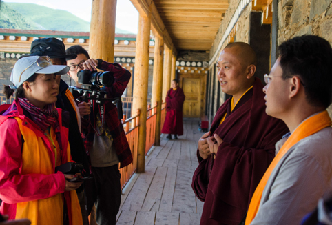 图为西藏支队同学在唐卡学校经堂进行拍摄。
