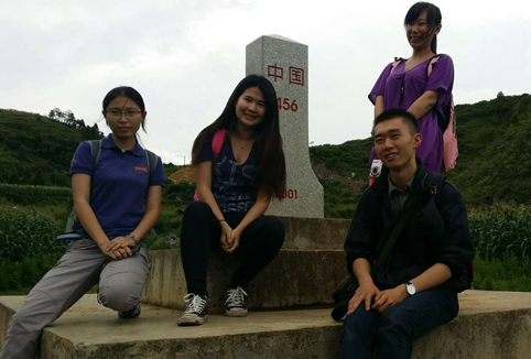 图为云南壮族歌书及语言调查支队同学在中越边境界碑。