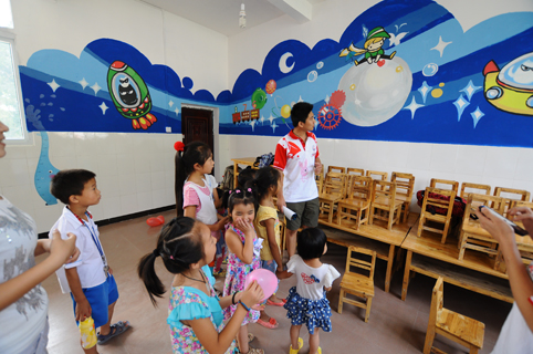 图为小朋友们看见赴重庆彭水县“优化校园,粉刷梦想”支队哥哥姐姐粉刷的新教室时开心的样子。