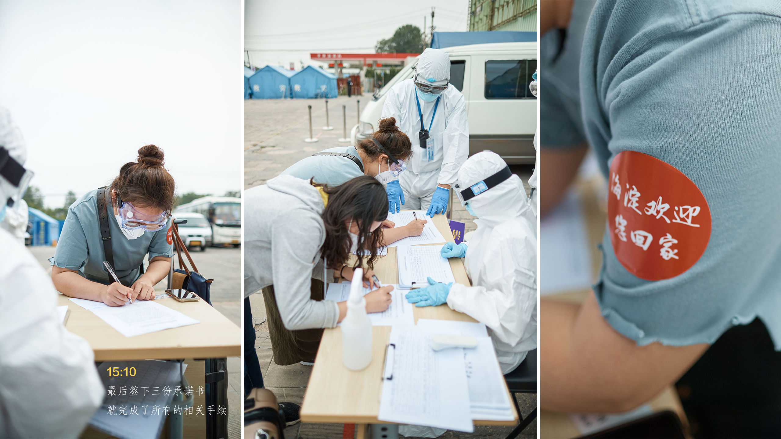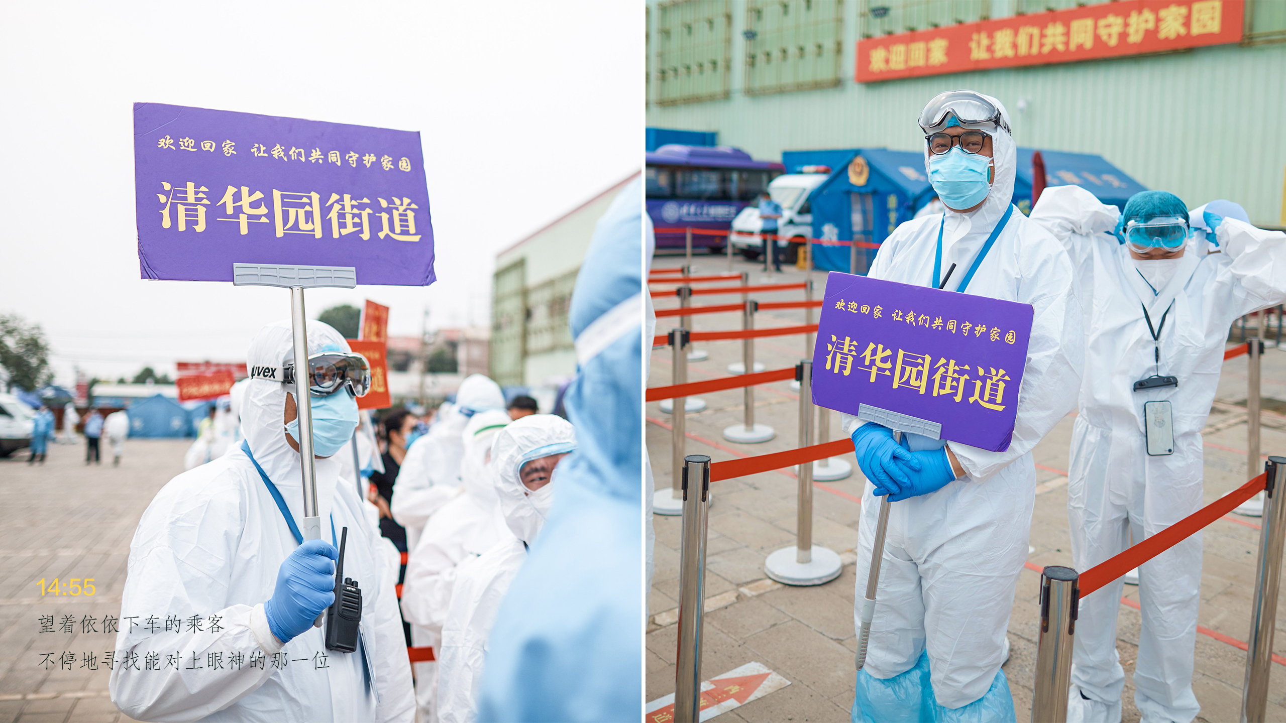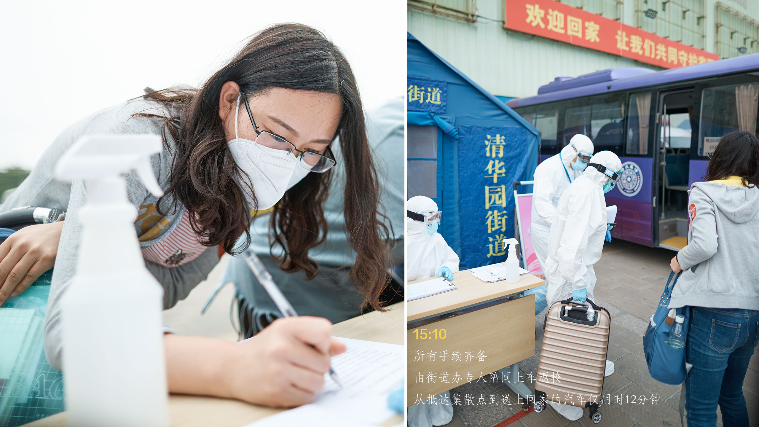 从抵达接站点到踏上回家的车,所有手续办理仅仅用了12分钟。像这样的流程每天要进行四遍,一直要持续到晚上十点。为了节省物资,接站人员只能一直这样穿着防护服等待返京人员的到来。大家明白,从湖北回来的乘客们经受着旅途劳顿和防疫工作的双重压力,心情难免有些不安,而我们唯一能做的就是将所有的办理程序以最有效的方式完成,尽快让返京人员踏上回家的校车。为了一份安心,所有工作人员穿着厚厚的防护服一次次地演练,里面都浸透了辛勤的汗水。
